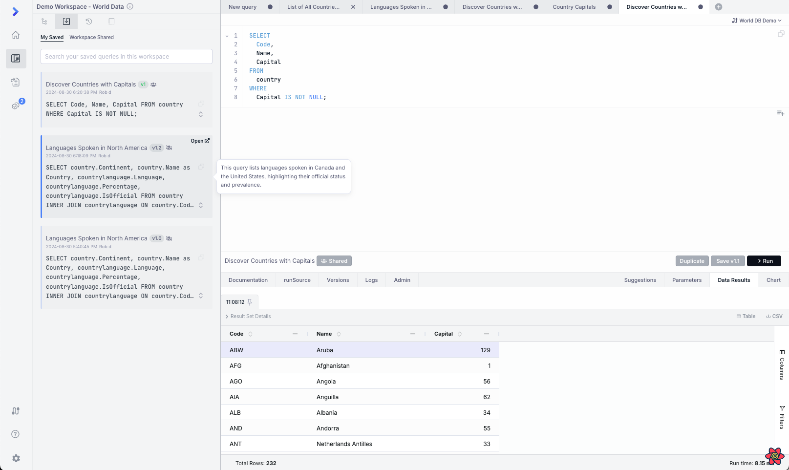 On first sign in, new users now get a hands-on tutorial of query suggestions, documentation, versioning, and saved queries in their own personal workspace.