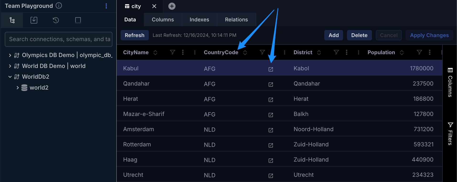In the table viewer you can now click on a field linked to a Foreign Key and jump straight to a new tab with the filtered table data.