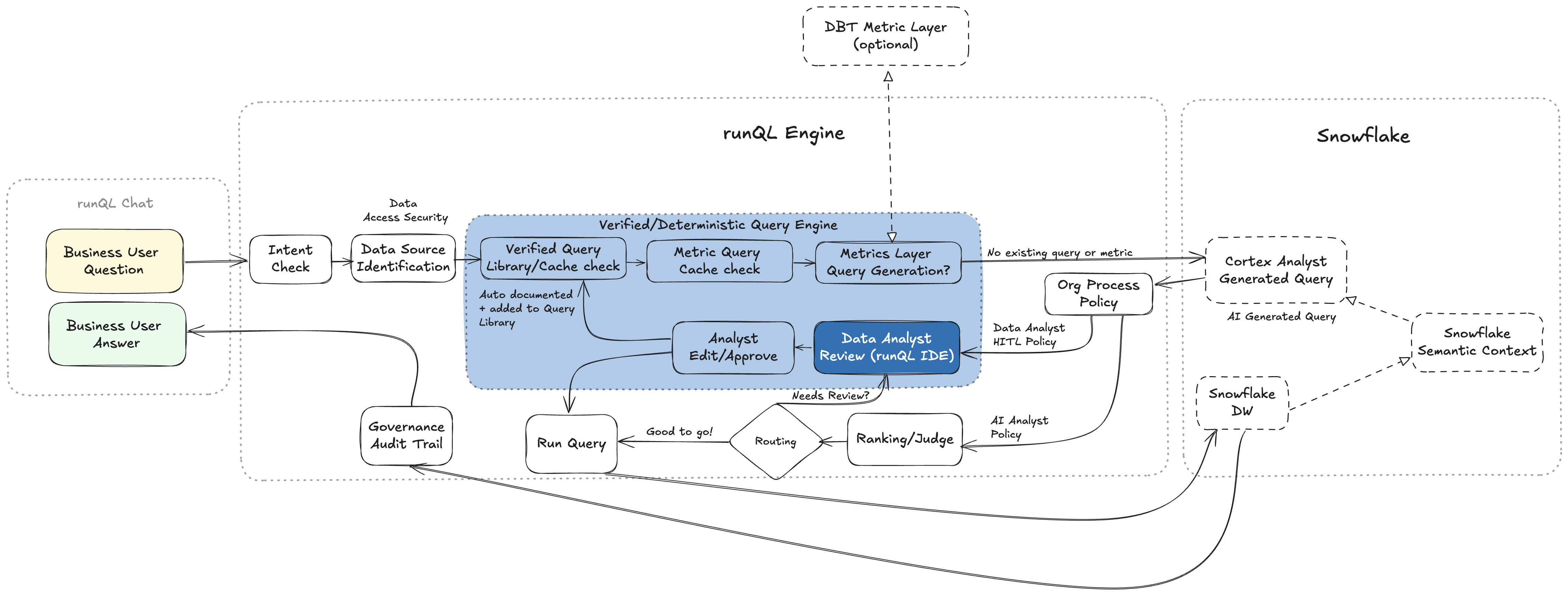 With this integration businesses can use runQL for the chat UI, Data Analyst workflows, and verified queries on top of Snowflake Cortex Analyst - bridging the gap between speed and trust.